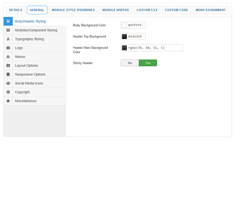 Module Style Overrides allow you to style individual module positions to your own taste. This greatly extends the control of how each of your module positions are displayed with a host of styling options including background image, background color, text color, heading color, button color and module padding. Multiple overrides can be created, each applied to the module position of your choice.