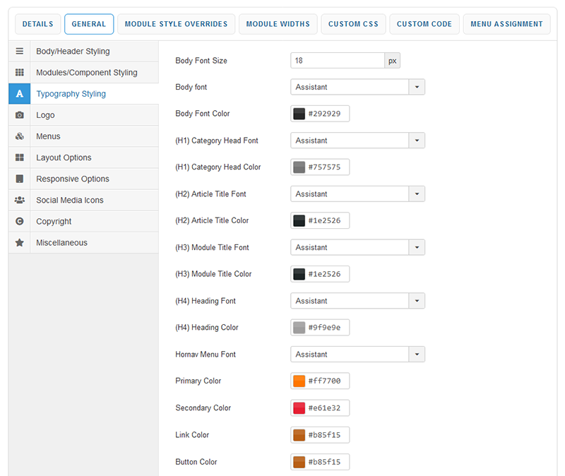 Here you will find some of the main Color Choosers for your template allowing you to control the colour of the main elements of your template including background images and colors, top menu, module positions etc. Other features in this section include font changers allowing to you to choose from 14 websafe fonts and over a 100 Google fonts for a number of different elements of your template including the body, article title and module title fonts. Also included is color choosers to set the article title, module title, content link and buttons to your own taste.